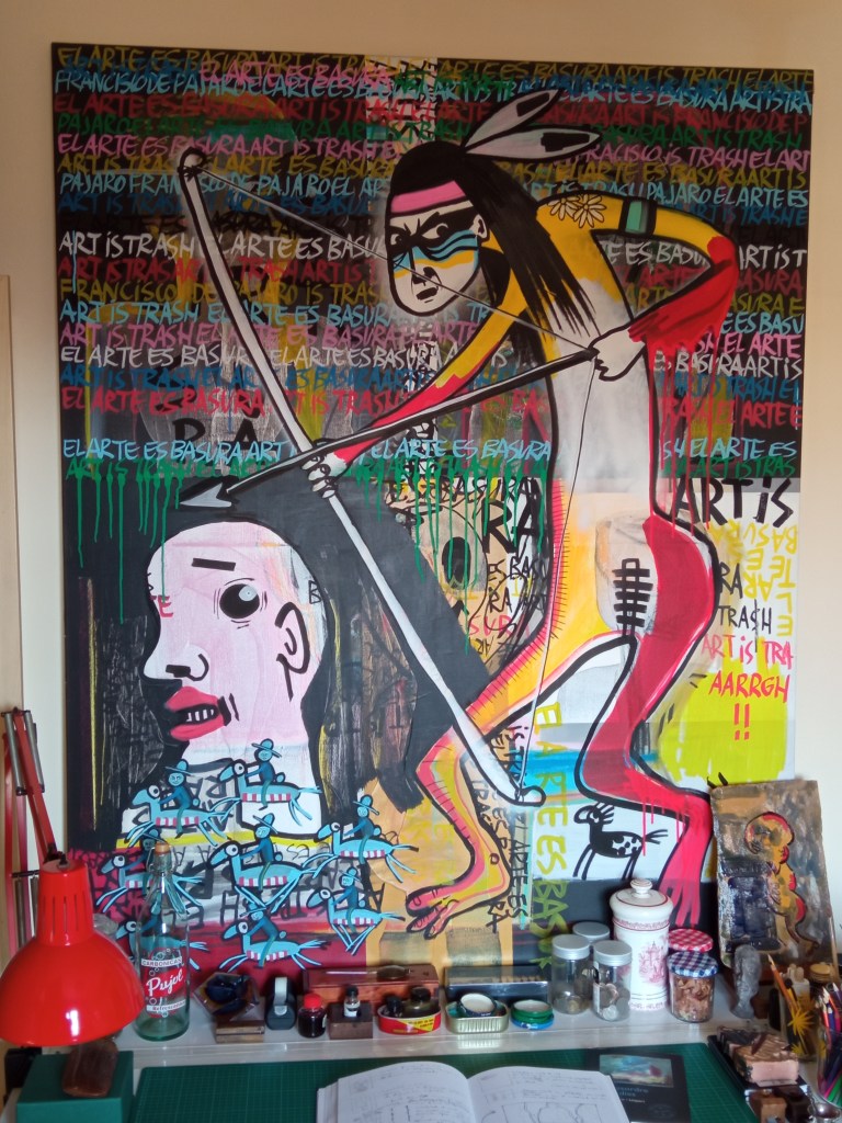 Francisco de Pájaro, artista que no hace falta clasificar ─resulta imposible─, hace un arte aparentemente humilde, probablemente producto de su rapidez en la ejecución y del concepto que él capta al vuelo, pero a la vez extraordinariamente denso, sobre todo por el mensaje que transmite. En las redes sociales se puede apreciar que es seguido por un numeroso público incondicional y fiel, entre los que yo me encuentro, pero también cuenta con numerosos detractores que lo critican, boicotean y hasta insultan ─es lo peor que se puede hacer porque no se queda mudo─, lo cual creo que a él le place todavía más, por su espíritu de transparente contradicción y por su permanente estado de crítica para con la sociedad en el sentido más amplio.